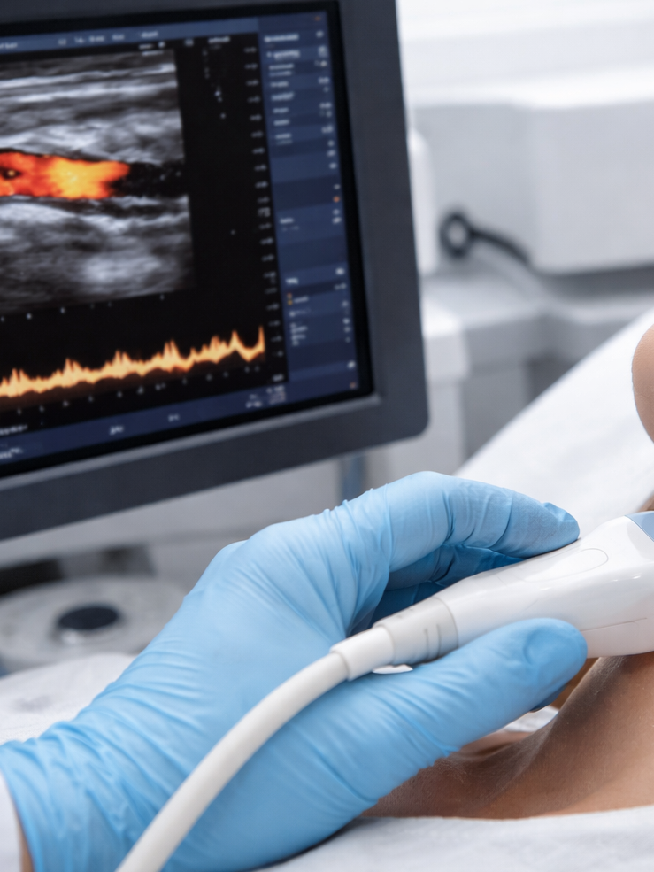 Die vaskuläre Duplexsonografie ist ein schmerzfreies, nicht-invasives Ultraschallverfahren, das anatomische Gefäßbilder (B-Bild) mit der farbigen Darstellung des Blutflusses (Doppler) kombiniert. Sie dient zur präzisen Diagnose von Durchblutungsstörungen und Arterienverkalkungen. Die Untersuchung erfolgt in Echtzeit am Hals bzw an der Schläfe.