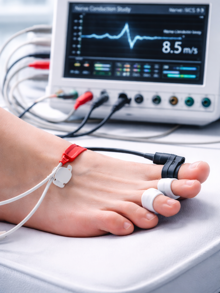 Die Nervenleitgeschwindigkeit (NLG) misst, wie schnell elektrische Impulse durch Nervenfasern geleitet werden, und dient der Diagnose von Nervenschäden, z.B. bei Polyneuropathie. Dabei wird über Elektroden gezielte elektrische Reize abgegeben und an einer definierten Stelle wieder abgeleitet. Diese Methode ist meist schmerzarm.